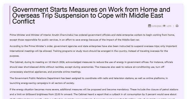泰国总理亲身下令世界干预节能情状:公事员强制居家办公,空调温度锁死在26-27度,辞谢穿西装打领带以减少空调负荷。