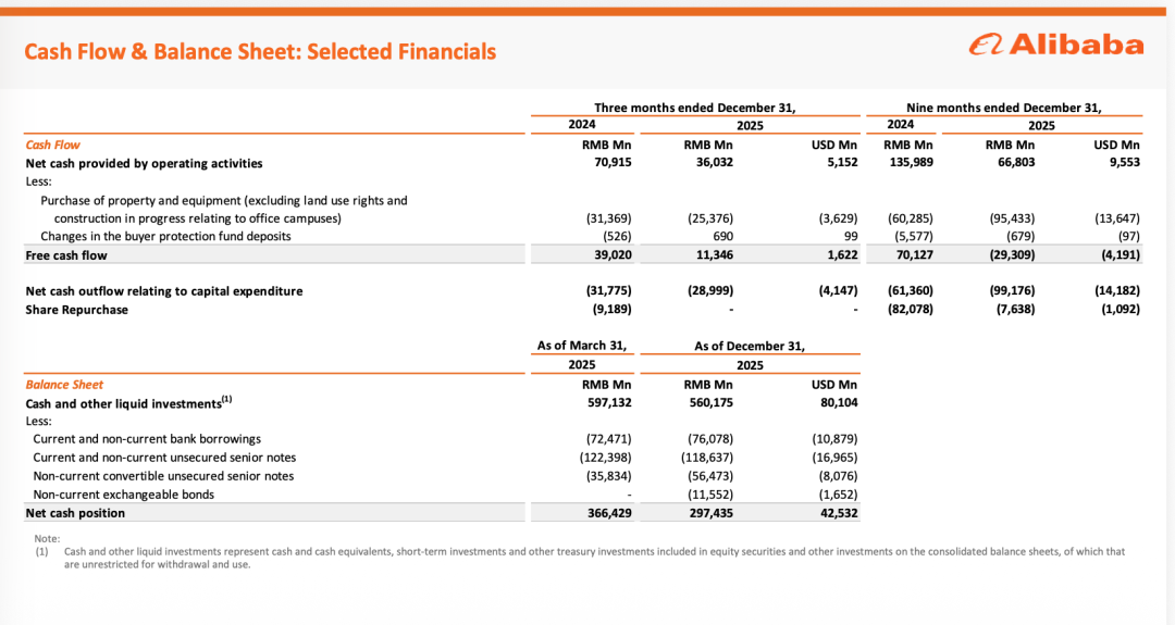 这组数字胜利回复了“钱花在哪”的问题:AI 基础要道和闪购补贴两端烧钱,谋略现款流被大幅压缩,摆脱现款流九个月累计转负近 300 亿。钞票欠债表上,限制 12 月 31 日净现款头寸从岁首的 3664 亿元降至 2974 亿元,九个月减少了约 690 亿。阿里仍然有实足的现款储备,但破钞速率在加速。