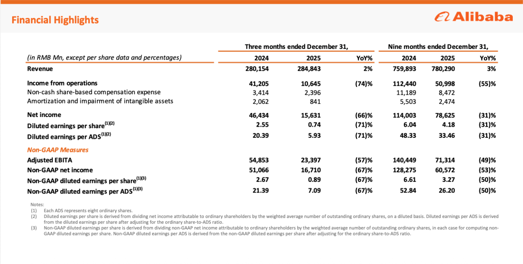 3 月 19 日,阿里巴巴发布 2026 财年第三季度功绩(限制 2025 年 12 月 31 日)。本季度阿里集团营收2848.4亿元东说念主民币,同比增长2%;剔除已出售的高鑫零卖和银泰业务,同口径收入同比增长9%。净利润 156.3亿元,同比下滑66%。Non-GAAP净利润167.1 亿元,同比下滑67%。经出动EBITA为234亿元,同比下滑 57%。