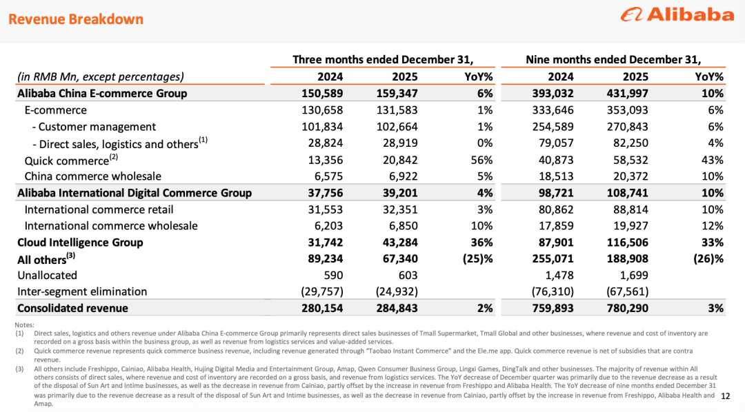 阿里正在变成截然不同的两面,一面是高增长的云和 AI ,另外一面,在闪购补贴和消费疲弱中防止前行。