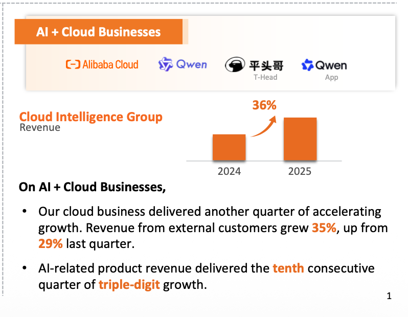 本季度云智能集团收入 432.8 亿元,同比增长 36%,较上季度的 34%(上上季度 26%)无间加速。外部客户收入增速为 35%,一样高于上季度的 29%。AI 相干产物收入相聚第十个季度保抓三位数增长。云业务经出动 EBITA 为 39.1 亿元,同比增长 25%。