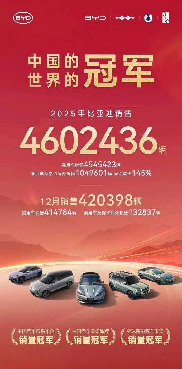 一边闷头搞自研,把电板、电机、电控全产业链攥在我方手里,靠着硬实力冲上全球新动力汽车销量榜首,把电动化上半场的胜局紧紧稳住。