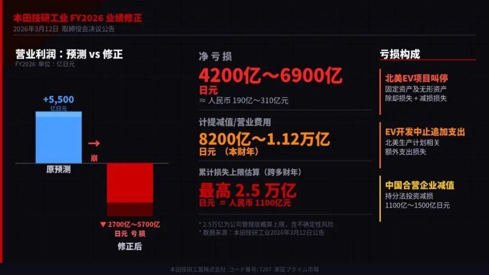 净利润腰斩、裁人5万东说念主的德国全球,仍是让汽车圈为之惊怖了。谁能念念到,日本巨头本田真是暴雷得更锐利。本田2025财年,巨亏最高约6900亿日元。