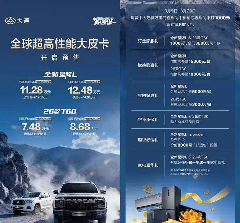 亚搏(中国)app 全新大通星际L以及2026款T60有望3月底至4月初完成上市