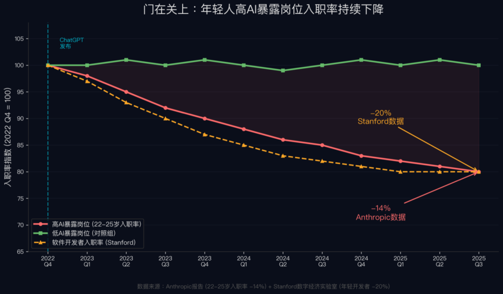 Anthropic评释里藏着一组不太起眼的数字:22到25岁年青东谈主在高AI骄气岗亭的入职率,着落了14%。