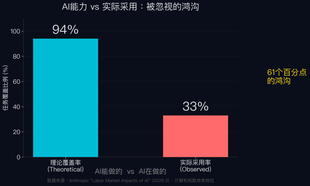 一个中枢发现:计较机和数学类岗亭,表面上94%的任务AI能完成。本色被选拔的比例:33%。