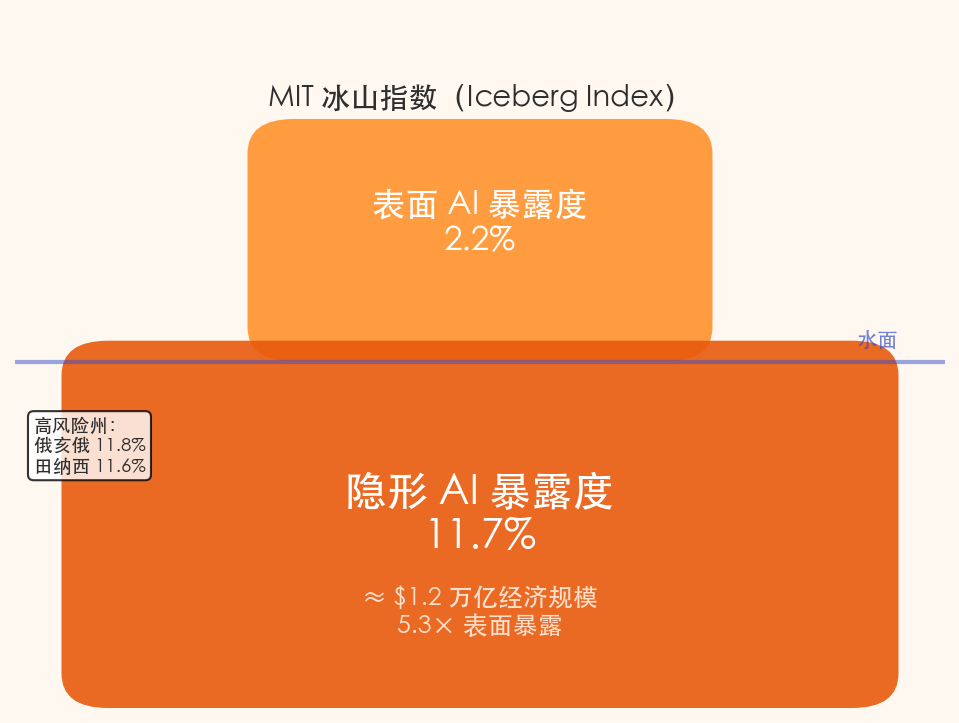 MIT冰山技俩(MIT数字经济实验室的研究团队)发布了一个指数叫Iceberg Index。名字自己便是论断——名义之下的东西高大于看得见的。