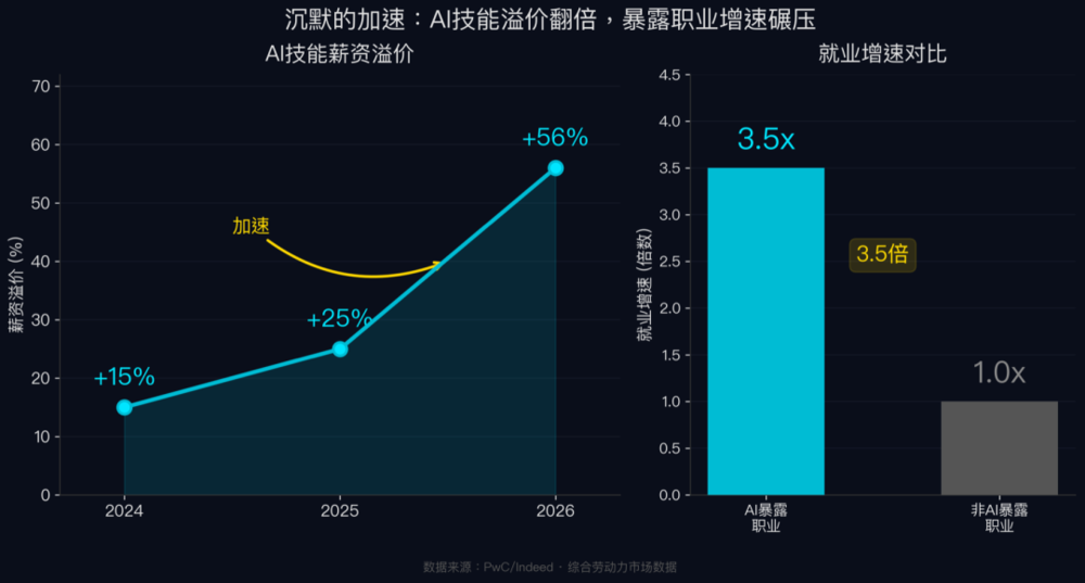 表面才智和本色选拔之间的61个百分点,不会遥远停在那边。Cognizant(大家最大IT服务公司之一)的追踪数据骄气,干事AI骄气度的年均增速照旧从2%加速到9%——4.5倍。PwC(普华永谈,大家四大司帐事务所之一)的大家AI服务晴雨表骄气,AI技巧薪资溢价从2024年的25%翻倍到了2025年的56%。AI骄气干事的服务增速,吊祭骄气干事的3.5倍。