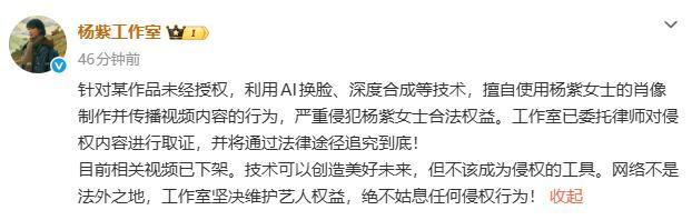 3 月 20 日下昼,杨紫职责室发文称:针对某作品未经授权,期骗 AI 换脸、深度合成等技能,私行使用杨紫女士的肖像制作并传播视频推行的行径,严重侵扰杨紫女士正当权利。职责室已奉求讼师对侵权推行进行取证,并将通过法律路子根究到底!