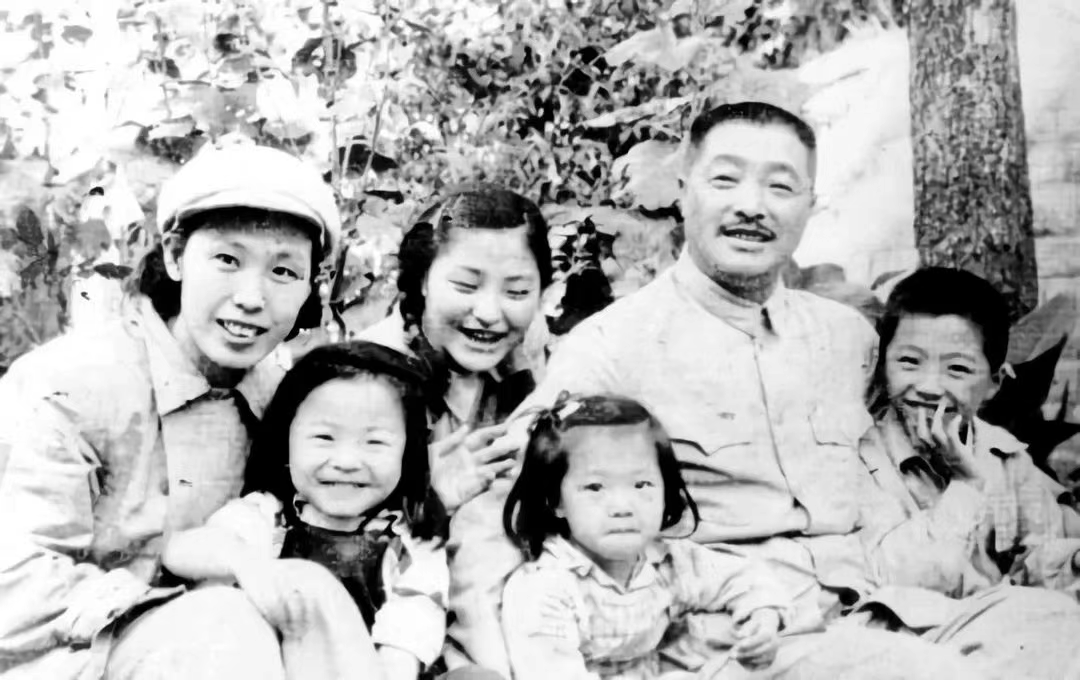 1951年春,贺龙一家在重庆。左起:薛明、贺晓明、贺捷生、贺早晨、贺龙、贺鹏飞
